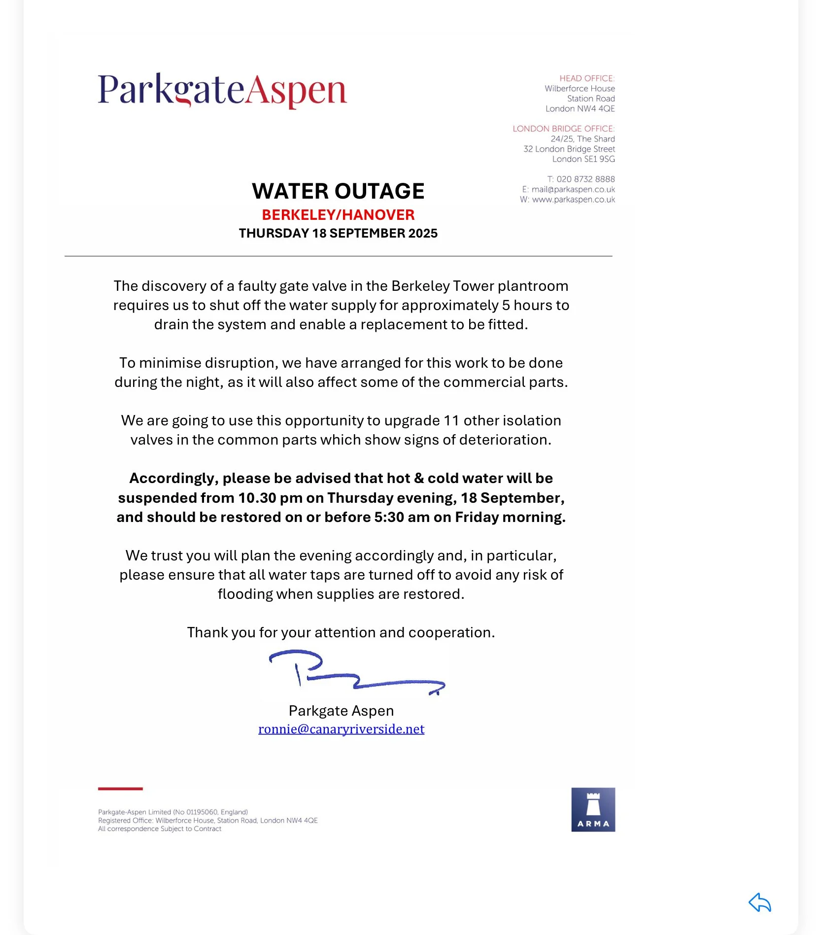 /Parkgate Aspen have advised that following the discovery of a faulty gate valve in the Berkeley Tower plant room the hot and cold water supply to Berkeley Tower and Hanover House will be shut off for c.5 hours from 10.30pm on Thursday 18th September until 5.30am on Friday 19th September.